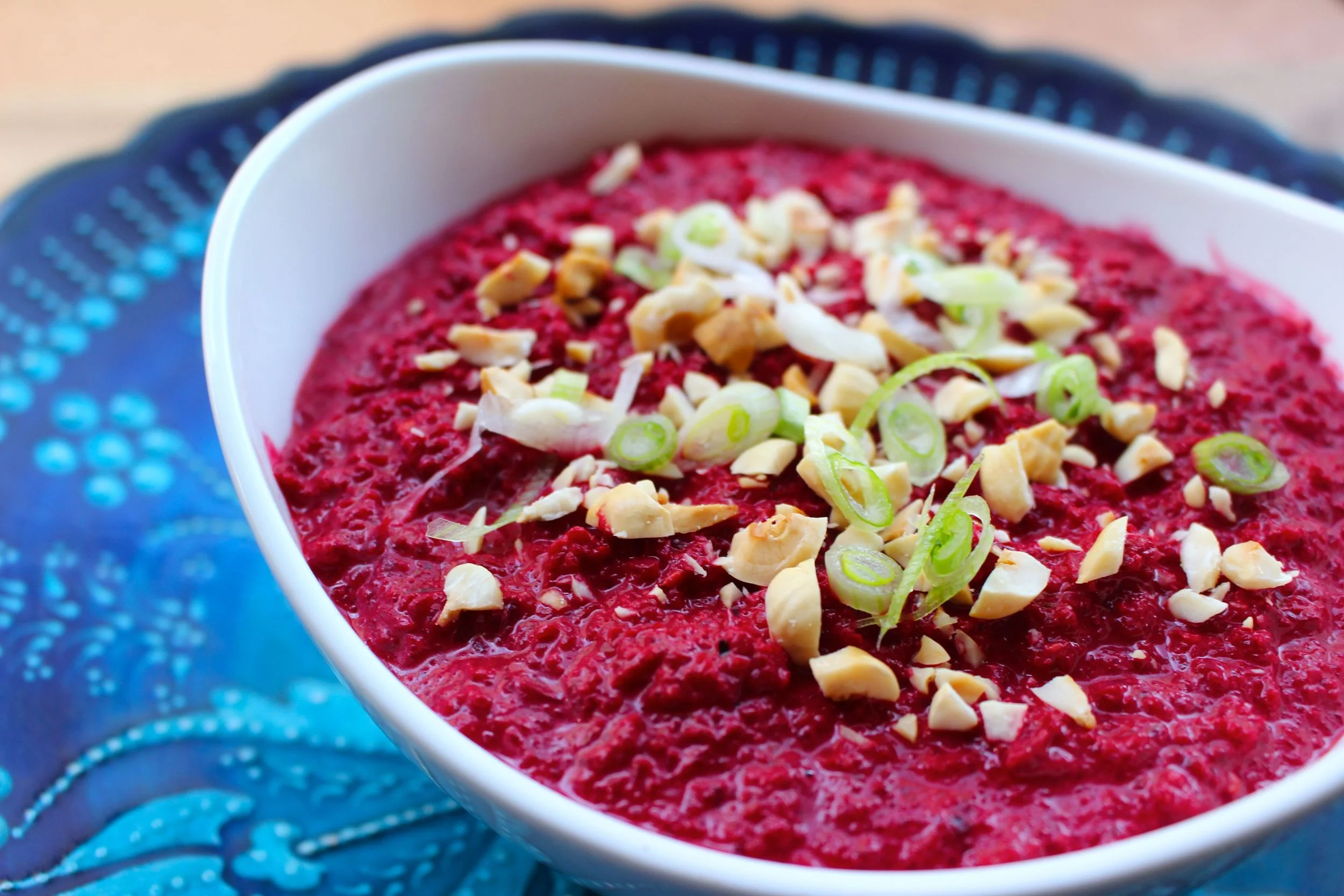 Transfer the dip to your serving bowl (I like to use white bowls to showcase the color) and sprinkle with green onions, hazelnuts and goat cheese. Drizzle with a bit more olive oil and serve with pita, brown bread or veggies.