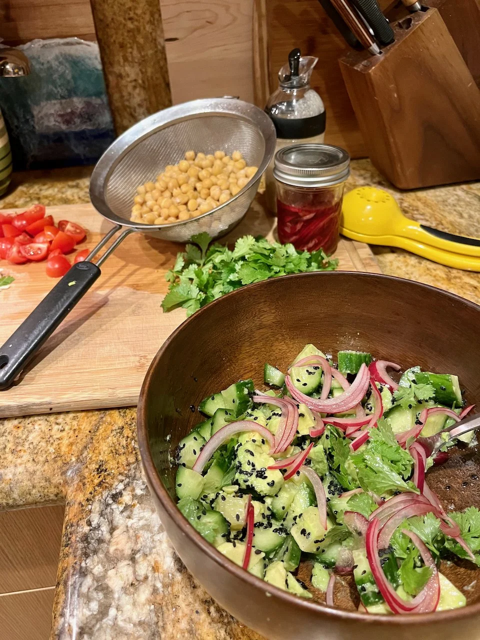 Make the cucumber salsa: Combine cucumber and avocado with a drizzle of olive oil and juice from half a lemon. Season with salt. Mix in half the pickled red onion slices (drained), half the cilantro, and the sesame seeds.