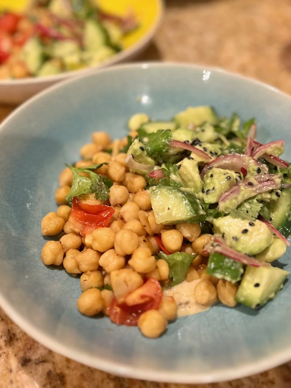 Plate: Get out 2-4 bowls - recipe serves 2 hungry people with some leftovers. Pour some dressing on bottom of each bowl. Top with chickpea mixture, cucumber salsa, and seared salmon. Drizzle with additional dressing.